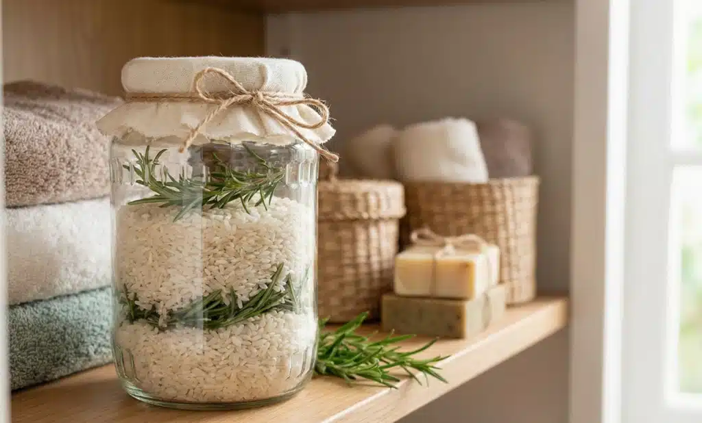Ein Glas mit Reis und Rosmarin fällt in diese Kategorie, weil es zwei sehr häufige Probleme löst: stickige Luft in geschlossenen Räumen und den „muffigen“ Geruch, der selbst nach dem Putzen noch vorhanden ist. Ohne Geräte, Sprays und starke Duftstoffe – es ist eine einfache Möglichkeit, die Atmosphäre mit Dingen, die Sie bereits in Ihrer Küche haben, angenehmer zu gestalten.