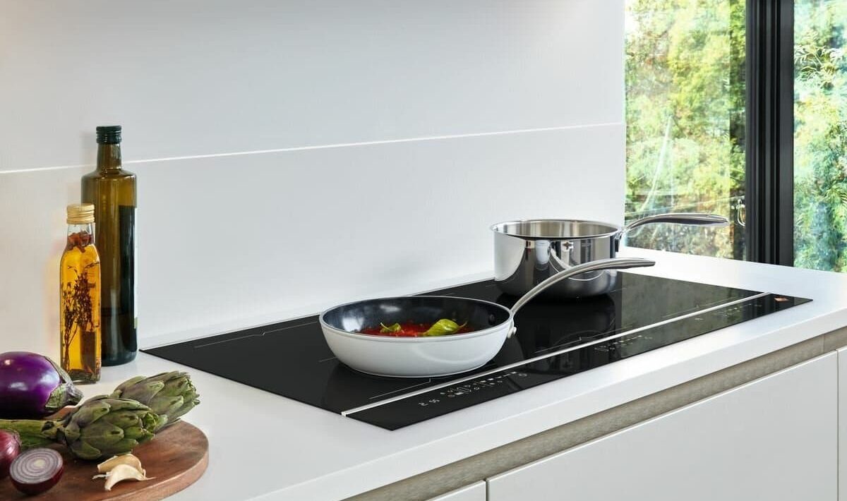 Das Prinzip ist einfach: Auf der Arbeitsplatte befindet sich keine separate schwarze Glasplatte. Die Induktionsspulen befinden sich unter dem Material der Arbeitsplatte (z. B. Keramik, Stein, Kunststein oder einem anderen hitzebeständigen Verbundwerkstoff) und darüber befindet sich eine völlig ebene Arbeitsfläche. Die Kochzonen sind in der Regel mit kleinen Markierungen gekennzeichnet, und die Bedienelemente befinden sich am Rand der Arbeitsplatte oder auf einem separaten Bedienfeld.
