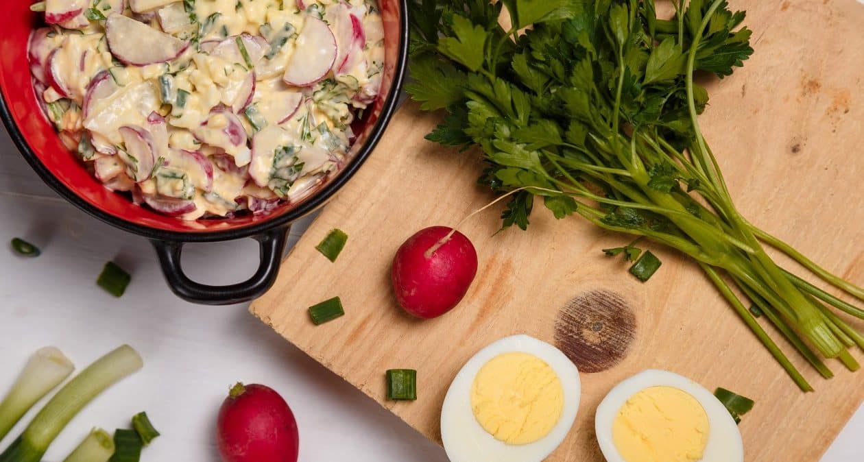 Rettich ist eines der ersten Gemüsesorten, die im Frühling erscheinen. Es ist knackig, leicht würzig und saftig. Es lohnt sich Kombinieren Sie es mit Schnittlauch, der zu dieser Jahreszeit ebenso frisch ist, und dem Osterklassiker, den Eiern. Dies ist eine viel leichtere und schnellere Variante als ein herkömmlicher Gemüsesalat. Um es zu schaffen Sie benötigen etwa 20 Minuten. Mein Nachbar hat mir das Rezept verraten und seitdem stehen bei mir jedes Jahr Radieschen auf dem Tisch. Mir gefällt alles, also glaube ich, dass es Ihnen auch gefallen wird.